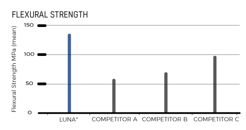 High flexural strength is paramount to mitigate tension and compressive forces teeth are exposed to in stress bearing situations1. Class I and Class II restorations are subject to high forces and require the use of materials with high flexural strength. With flexural strength of 136 MPa, Luna is ideal for use in stress bearing areas and is designed to withstand the forces of mastication.