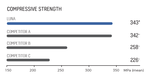 Luna has a filler load of 77% by weight. Strontium glass filler in combination with the carefully selected filler loading, delivers high compressive strength to enhance the longevity of restorations.
